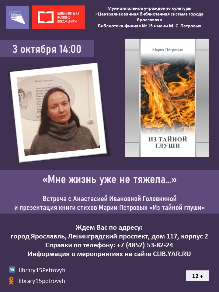3 октября в 14:00 в библиотеке-филиале № 15 имени М. С. Петровых пройдет встреча с Анастасией Ивановной Головкиной «Мне жизнь уже не тяжела…» и презентация книги стихов Марии Петровых «Из тайной глуши» Читать далее