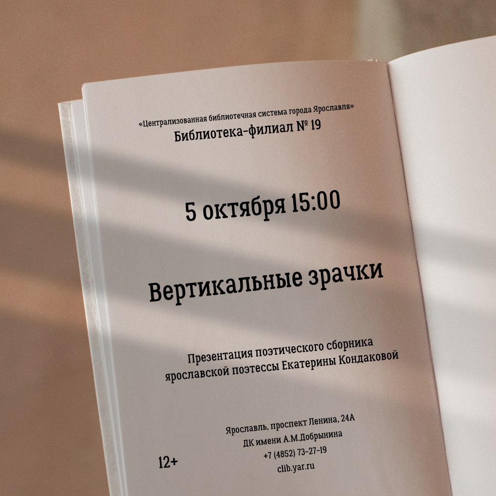 5 октября в 15:00 в библиотеке №19 пройдёт презентация поэтического сборника «Вертикальные зрачки» ярославской поэтессы Екатерины Кондаковой Читать далее
