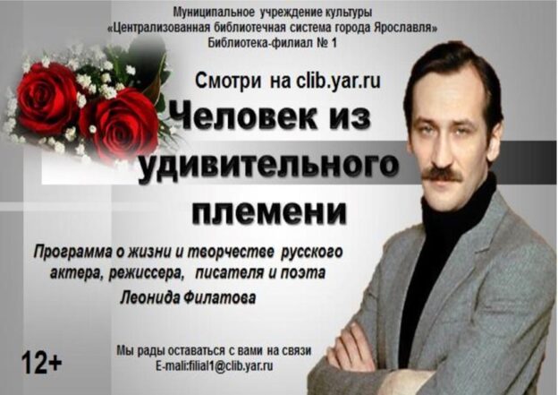 Библиотека-филиал № 1 продолжает цикл программ «Мастера российского кино». В представленной онлайн-программе «Человек из удивительного племени» вы узнаете о жизни и творчестве Леонида Филатова, которая подготовлена к юбилею актера.