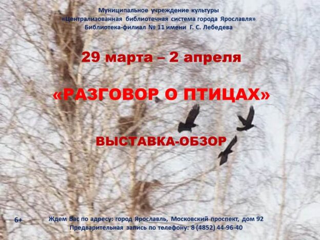 В дни весенних каникул, с 29 марта по 2 апреля, школьников младшего и среднего возраста приглашает читальный зал библиотеки-филиала № 11 имени Г. С. Лебедева на выставку-обзор «Разговор о птицах».