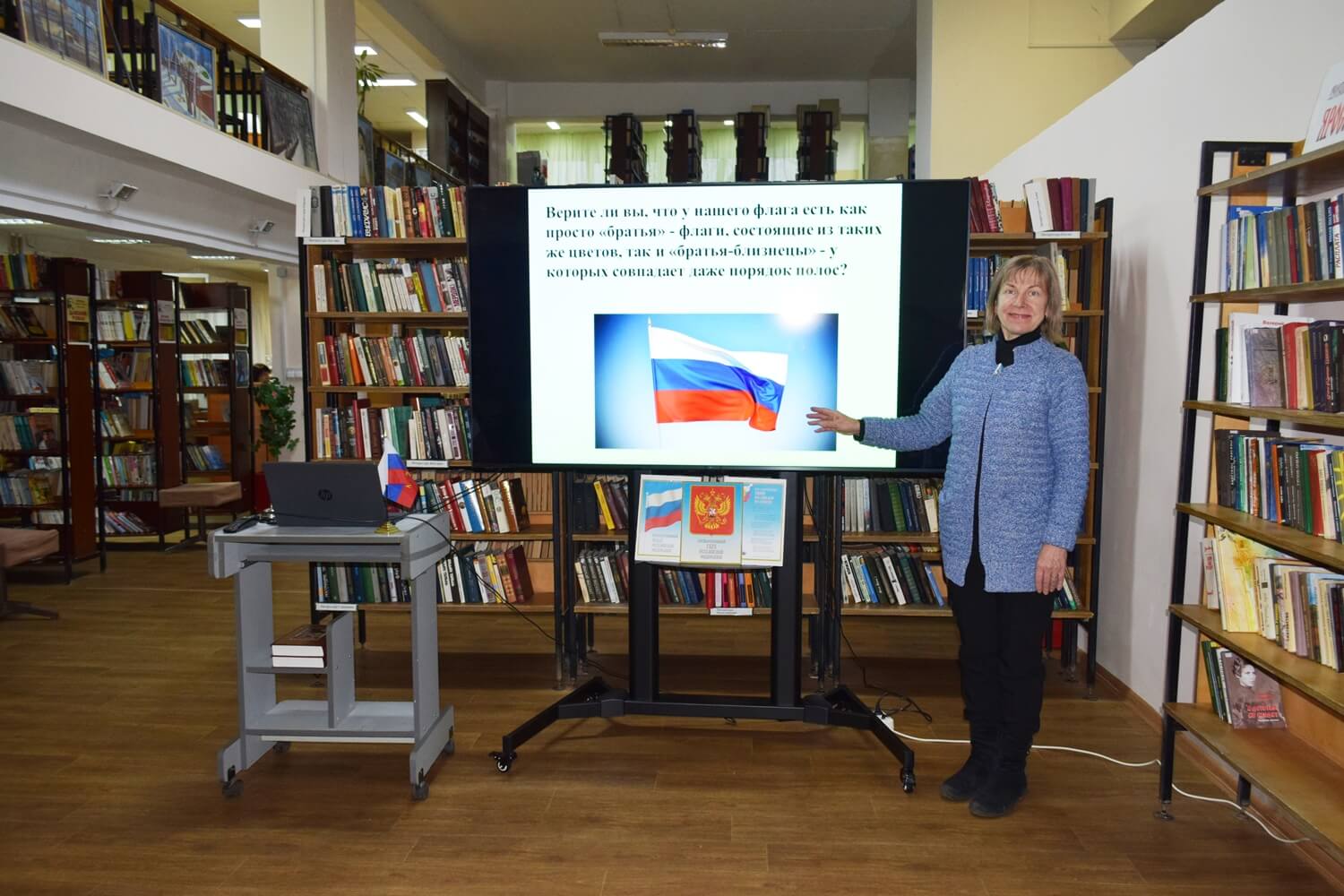 Состоялась игра «Верю – не верю», в ходе которой можно было узнать много интересного о флагах мира. Был показан информационный сюжет, рассказывающий об истории флага России. Прозвучал гимн, мелодия которого знакома не одному поколению сограждан – она была написана композитором Александром Александровым ещё до Великой Отечественной войны, в 1939 году, а вот слова менялись трижды. Но каким бы ни был текст, одно неизменно: слушать официально принятый гимн следует стоя. Эти и другие правила обращения с символами ведущая напомнила в ходе встречи.