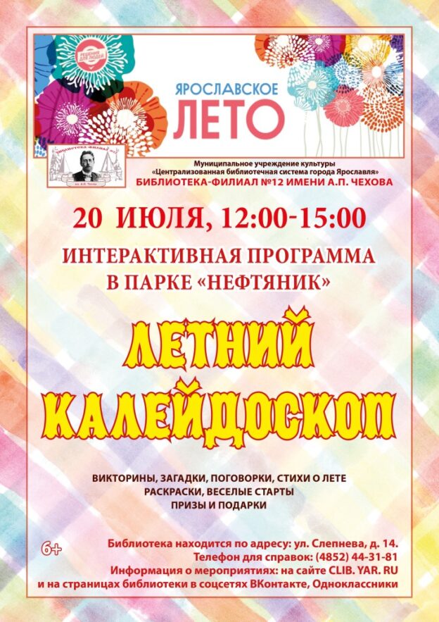 20 июля с 12:00 до 15:00 в рамках губернаторского проекта «Ярославское лето» сотрудники библиотеки имени А. П. Чехова проведут в парке «Нефтяник» интерактивную программу «Летний калейдоскоп».