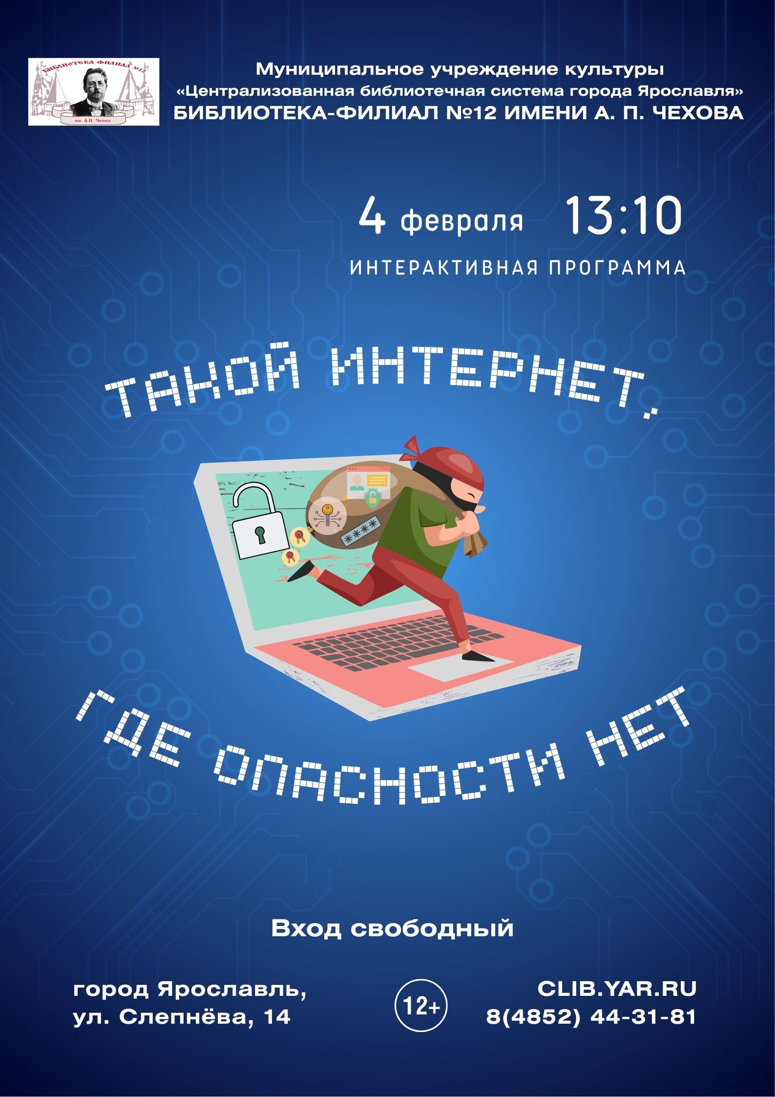 4 февраля в 13:10 библиотека-филиал № 12 имени А. П. Чехова ко Всемирному дню безопасного интернета проводит интерактивную программу.