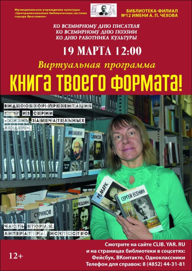19 марта в 12:00 библиотека-филиал № 12 имени А. П. Чехова проводит виртуальную программу «Книга твоего формата! Литература. Искусство».