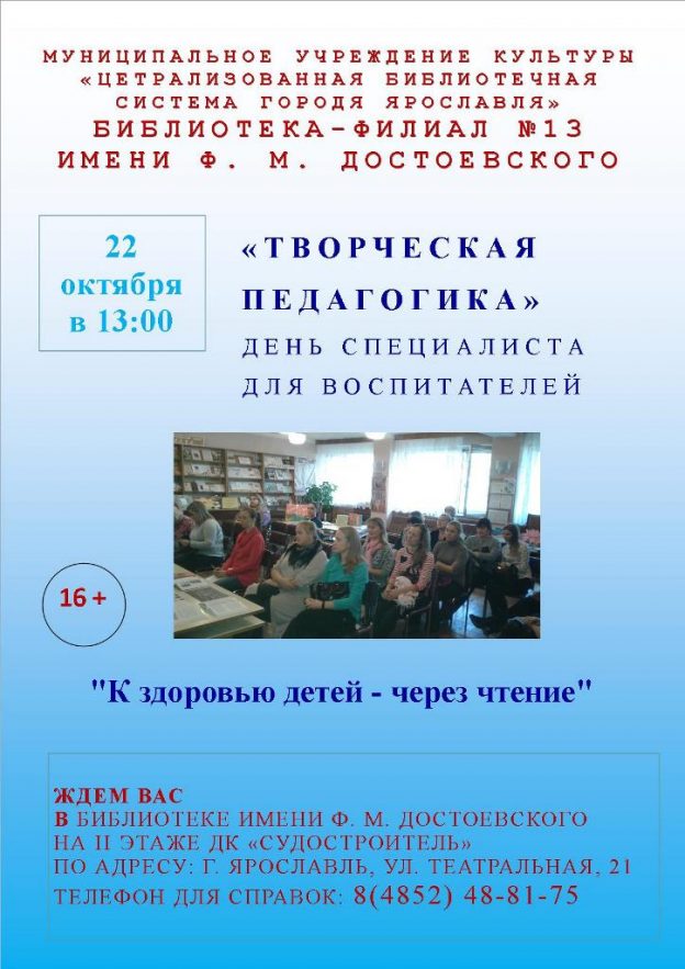 22 октября в 13:00 в библиотеке-филиале № 13 имени Ф. М. Достоевского состоится Ежегодный День специалиста «Творческая педагогика».