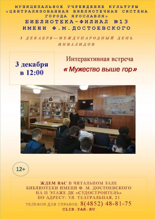 3 декабря в 12:00 в библиотеке-филиале № 13 имени Ф. М. Достоевского состоится интерактивная встреча «Мужество выше гор», приуроченная к Международному дню инвалидов.