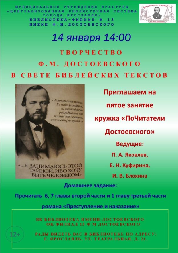 14 января в 14:00 в библиотеке-филиале № 13 имени Ф. М. Достоевского состоится пятое занятие кружка «ПоЧитатели Достоевского» в рамках проекта «Творчество Ф. М. Достоевского в свете Библейских текстов».