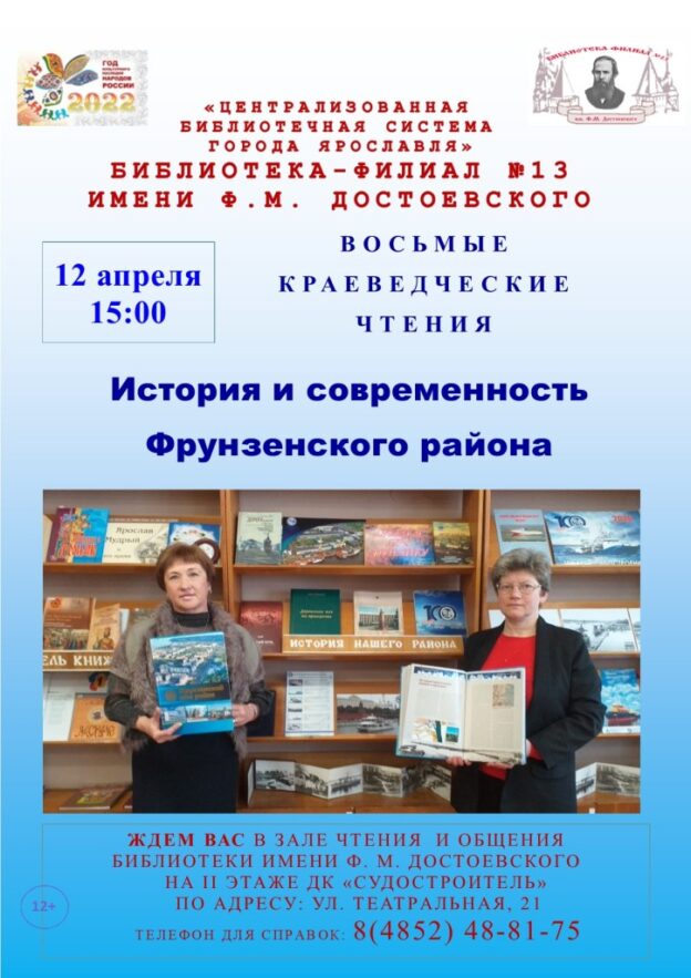 12 апреля в 15 часов в библиотеке-филиале № 13 имени Ф. М. Достоевского состоятся Восьмые краеведческие чтения «История и современность Фрунзенского района города Ярославля».
