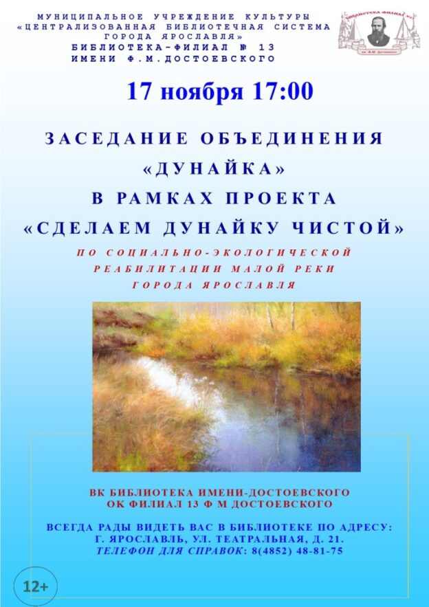17 ноября в 17:00 в библиотеке-филиале № 13 имени Ф. М. Достоевского состоится заседание объединения «Дунайка» в рамках проекта «Сделаем Дунайку чистой» по социально-экологической реабилитации малой реки города Ярославля и прудов на ней.