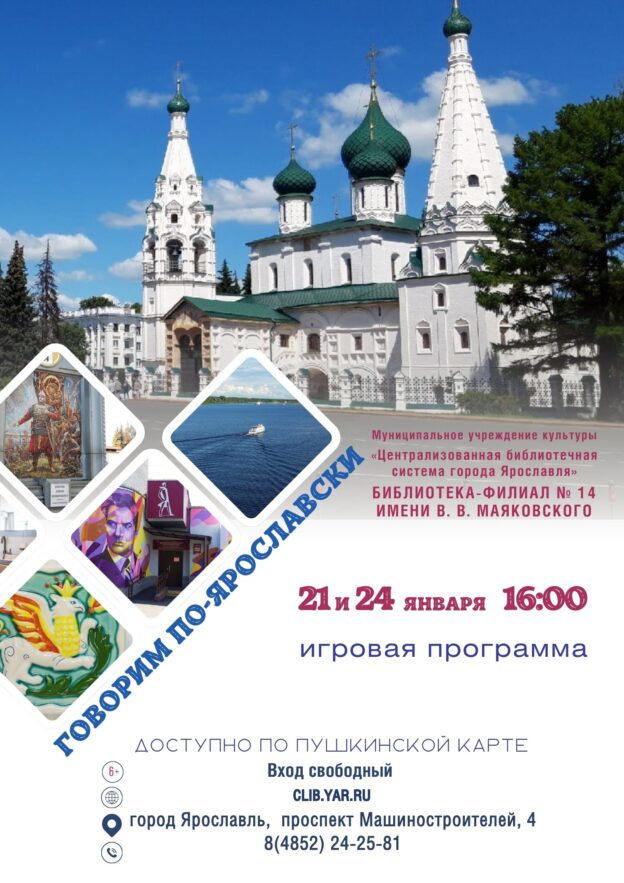 21 и 24 января в 16:00 библиотека-филиал №14 имени В. В. Маяковского приглашает посетить игру «Говорим по-ярославски».
