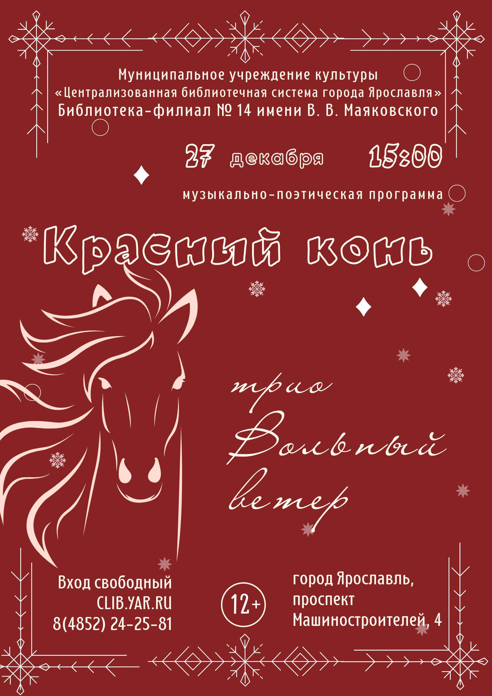 27 декабря в 15:00 в библиотеке имени В. В. Маяковского выступит трио «Вольный ветер». Вокалисты представят музыкально-поэтическую программу «Красный конь», посвящённую символу 2026 года.