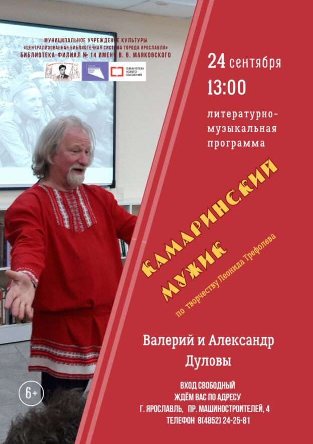 24 сентября в 13:00 в библиотеке-филиале № 14 имени В. В. Маяковского состоится литературно-музыкальная программа «Камаринский мужик», посвященная творчеству ярославского поэта Леонида Трефолева, подготовленная братьями Валерием и Александром Дуловыми.