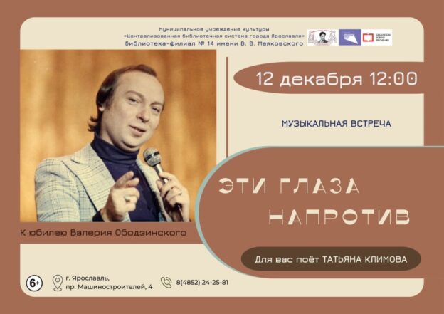 12 декабря в 12:00 в библиотеке-филиале № 14 имени В. В. Маяковского состоится музыкальная встреча «Эти глаза напротив», к юбилею Валерия Ободзинского. Поёт Татьяна Климова.