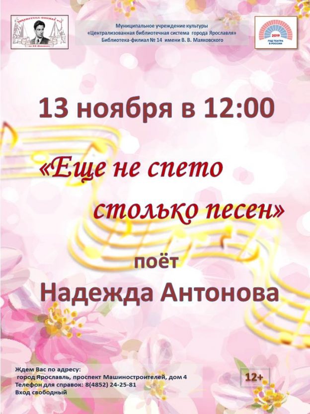 13 ноября в 12:00 в библиотеке-филиале № 14 имени В. В. Маяковского состоится выступление исполнительницы русских романсов Надежды Константиновны Антоновой «Ещё не спето столько песен».