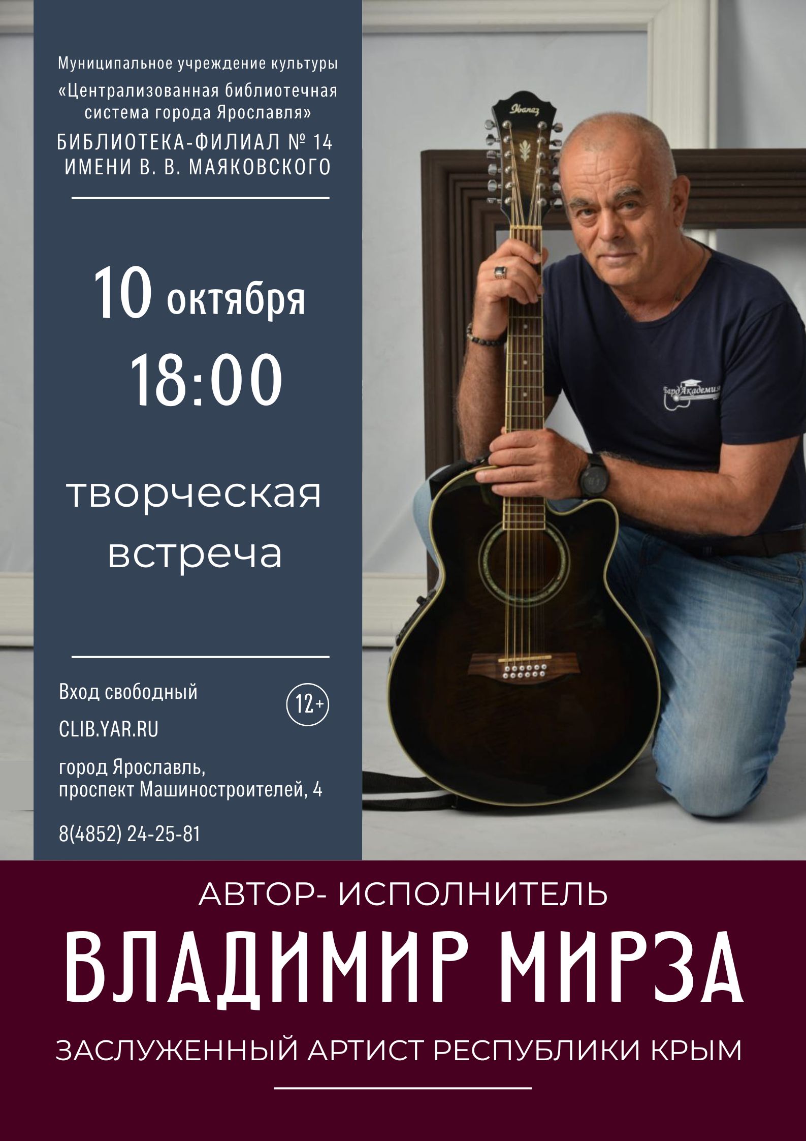 10 октября в 18:00 в библиотеке-филиале № 14 имени В. В. Маяковскогосостоится творческая встреча с Владимиром Мирзой