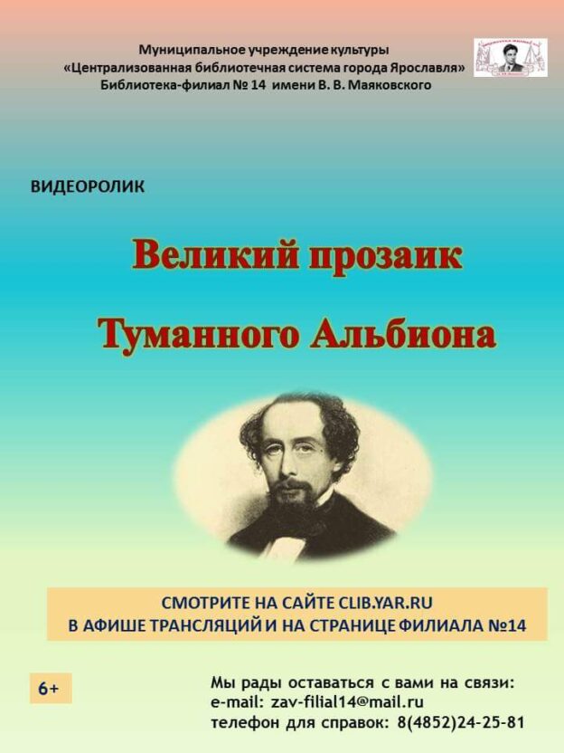 Библиотека-филиал № 14 имени В. В. Маяковского подготовила видеоролик «Великий прозаик Туманного Альбиона» к 210-летию со дня рождения английского писателя Чарльза Диккенса.