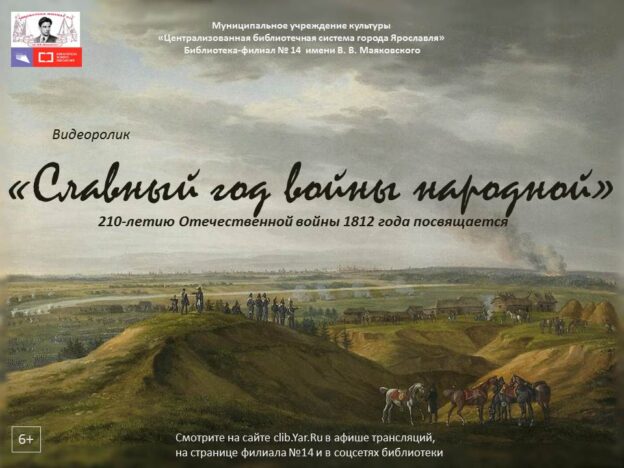 Библиотека-филиал № 14 имени В. В. Маяковского подготовила видеоролик «Славный год войны народной», посвященный 210-летию Отечественной войны 1812 года.