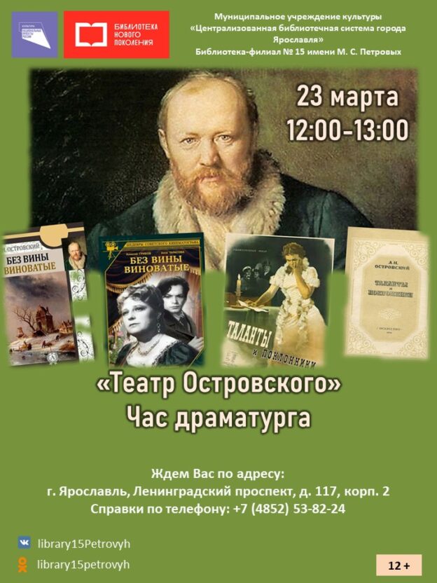 23 марта с 12:00 до 13:00 в библиотеке-филиале № 15 имени М. С. Петровых пройдет час драматурга «Театр Островского», посвященный 200-летию со дня рождения драматурга и писателя.