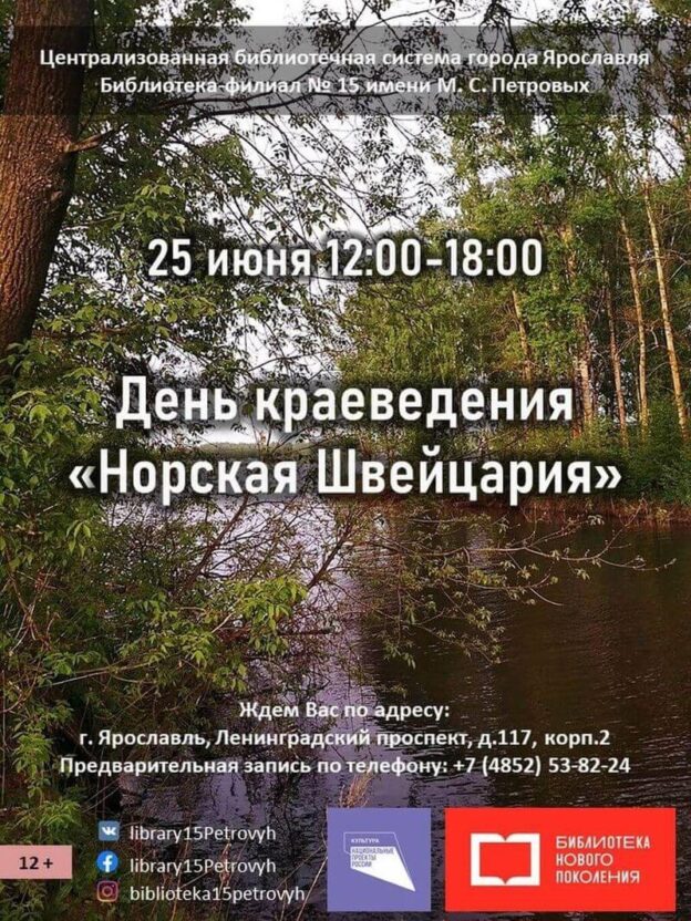 25 июня с 12:00 до 18:00 в библиотеке-филиале № 15 имени М. С. Петровых пройдёт день краеведения «Норская Швейцария».