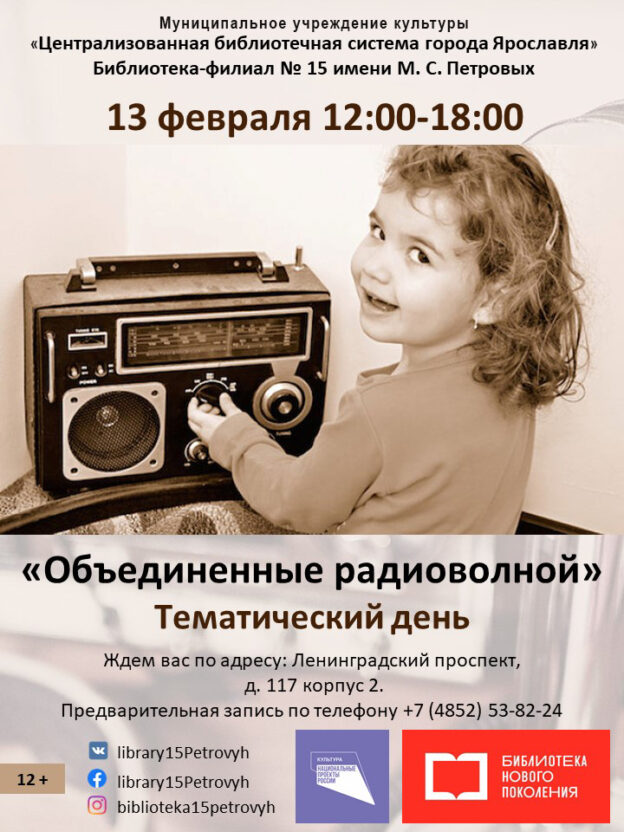 13 февраля с 12:00 до 18:00 библиотека-филиал № 15 имени М. С. Петровых проведет тематический день «Объединённые радиоволной».