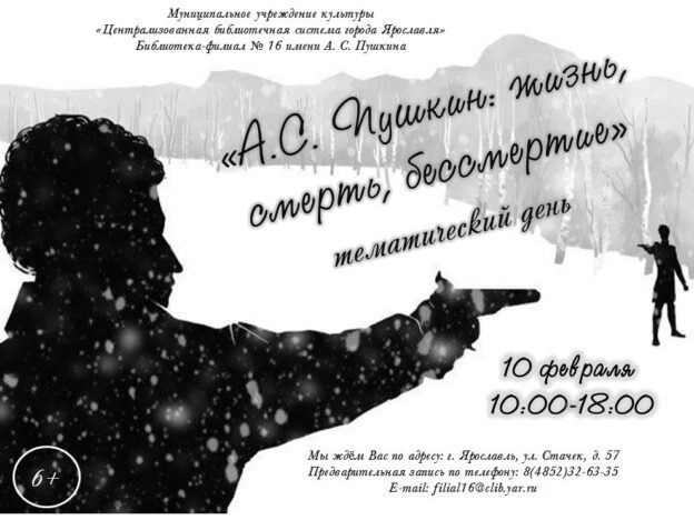 10 февраля с 10:00 до 18:00 в библиотеке-филиале № 16 имени А. С. Пушкина пройдёт тематический день «А. С. Пушкин: жизнь, смерть, бессмертие».