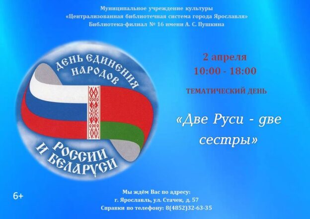 В День единения народов Беларуси и России, 2 апреля, для читателей и гостей детского абонемента начнёт работу книжная выставка «Россия и Беларусь — мы вместе», где будут представлены книги писателей наших братских стран; информационный час «Россия и Белоруссия: общая история, общая судьба» познакомит с историей единения двух народов.