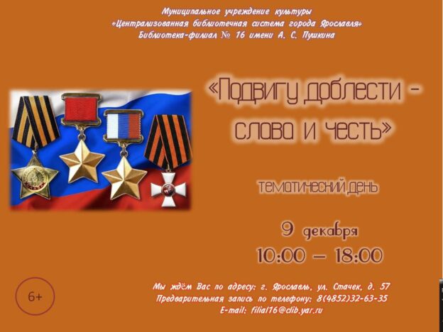 9 декабря с 10:00 до 18:00 в библиотеке-филиале № 16 имени А. С. Пушкина пройдёт тематический день «Подвигу доблести – слава и честь», посвящённый Дню Героев Отечества.