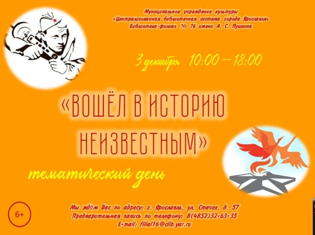 3 декабря с 10:00 до 18:00 в библиотеке-филиале № 16 имени А. С. Пушкина пройдёт тематический день «Вошёл в историю неизвестным», посвящённый Дню Неизвестного Солдата.