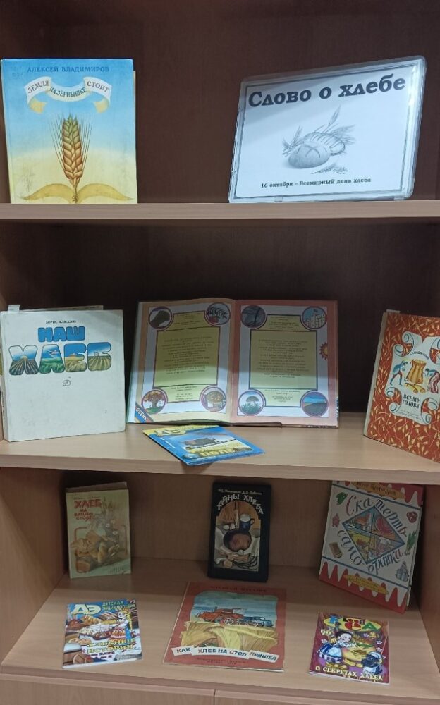 В читальном зале к знаменательной дате была подготовлена книжная выставка «Слово о хлебе», на полках которой была представлена литература о хлебе как о главном сельскохозяйственном продукте, о его значении в жизни людей, о развитии хлебопекарного дела, пути, который проходит хлеб от пшеничного зерна до ароматного каравая на столе.