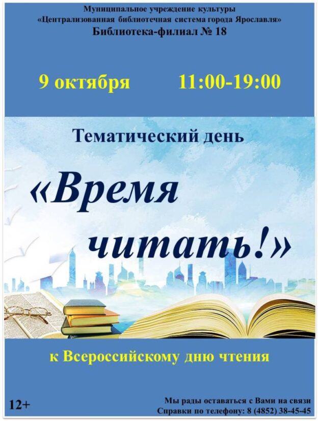 9 октября с 11:00 до 19:00 в библиотеке-филиале № 18 пройдет тематический день «Время читать!», посвященный Всероссийскому дню чтения.