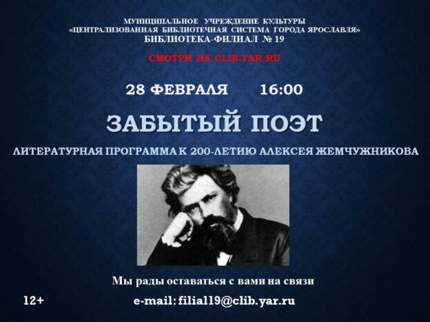 28 февраля в 16: 00 библиотека-филиал № 19 приглашает посмотреть литературную программу «Забытый поэт», посвящённую русскому поэту Алексею Жемчужникову, 200-летний юбилей которого отмечается в этом году.