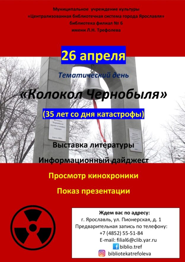 В библиотеке-филиале № 6 имени Л. Н. Трефолева в Международный день памяти 26 апреля c 11:00 до 19:00 состоится тематический день «Колокол Чернобыля», приуроченный к 35-летию со дня катастрофы на Чернобыльской атомной электростанции.