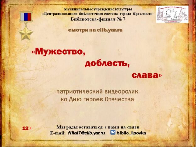 Библиотека-филиал № 7 представляет патриотический видеоролик «Мужество, доблесть, слава», посвященный Дню Героев Отечества.