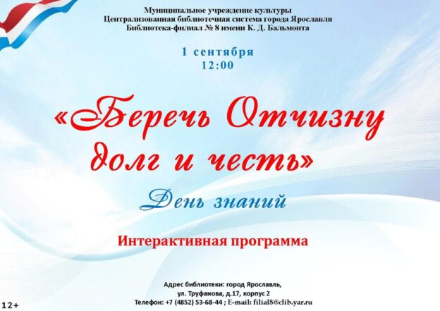1 сентября в 12:00 библиотека-филиал № 8 имени К. Д. Бальмонта проведёт интерактивную программу «Беречь Отчизну — долг и честь», посвящённую Дню знаний для молодёжи Ярославля.