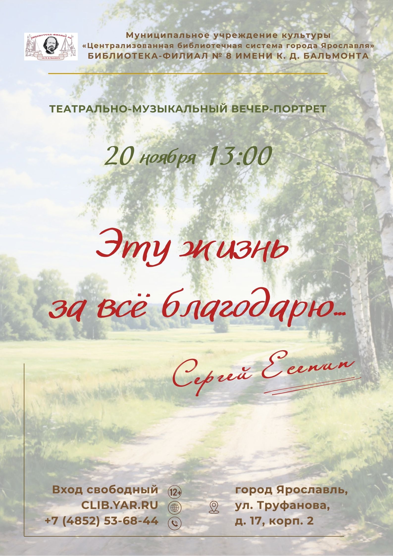 20 ноября в 13:00 в библиотеке имени К. Д. Бальмонта состоится театрально-музыкальный вечер-портрет по творчеству Сергея Есенина «Эту жизнь за всё благодарю»