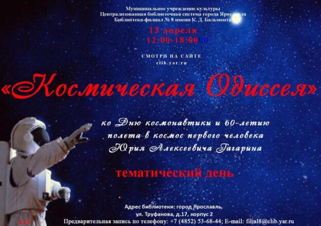 13 апреля с 12:00 до 18:00 в рамках сетевой акции «Он сказал «Поехали!» ко Дню космонавтики и 60-летию полета в космос первого человека Юрия Алексеевича Гагарина библиотека-филиал № 8 имени К. Д. Бальмонта проведет тематический день «Космическая Одиссея».