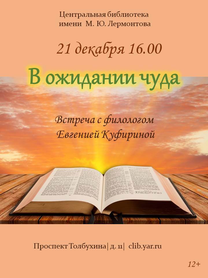 21 декабря в 16:00 в Центральной библиотеке имени М. Ю. Лермонтова состоится встреча с филологом Евгенией Куфириной «В ожидании чуда». Читать далее
