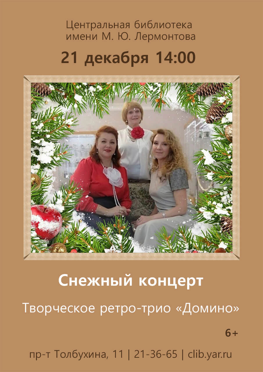 21 декабря в 14:00 в Центральной библиотеке имени М. Ю. Лермонтова состоится «Снежный концерт» творческого ретро-трио «Домино». Читать далее