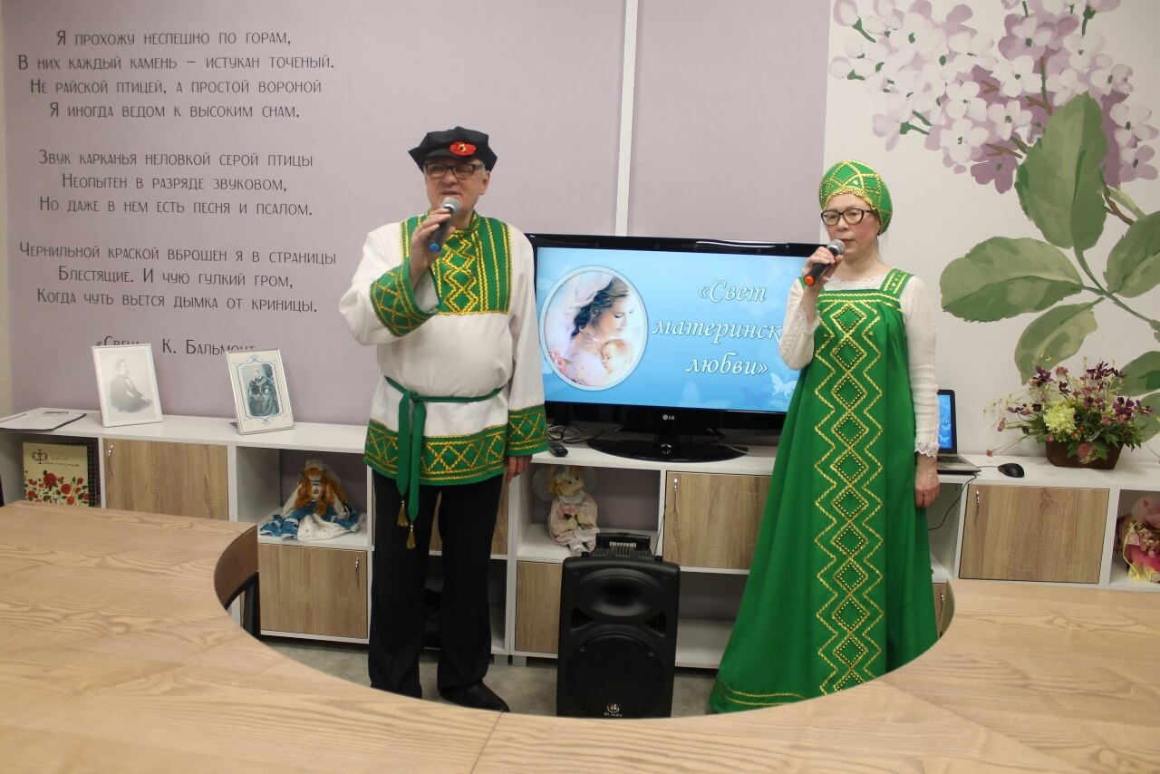 В библиотеке-филиале им. К.Д. Бальмонта ко Дню матери прошла праздничная программа «Главная должность на земле», ставшая прекрасным поводом выразить свою любовь и глубокую благодарность главному в жизни человеку – маме. Тёплую и душевную атмосферу создала литературно–поэтическая презентация «Слово о матери». Для гостей мероприятия была предложена концертная программа «Тепло твоих лучистых глаз» в исполнении творческого дуэта «Верные друзья». Александр Вернер и Татьяна Клепикова проникновенно исполнили любимые и хорошо знакомые песни о маме, а также русские народные песни. Знатоков литературы и искусства выявил конкурс «Всё на земле от материнских рук».