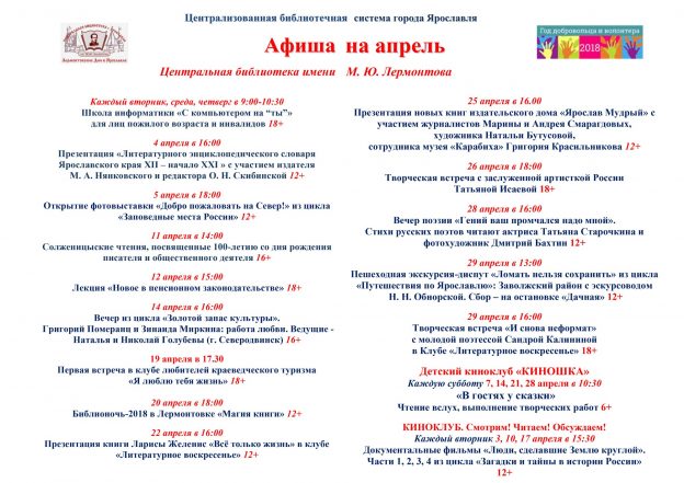 Афиша мероприятий Центральной библиотеки имени М. Ю. Лермонтова на апрель