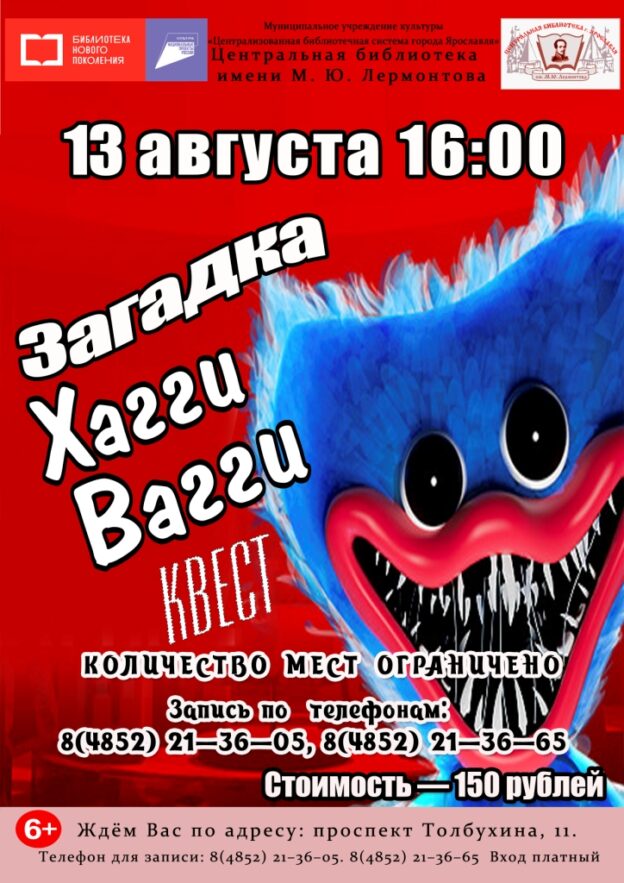 13 августа в 16:00 Центральная библиотека имени М. Ю. Лермонтова приглашает принять участие в анимационном квесте «Загадка Хагги Вагги».