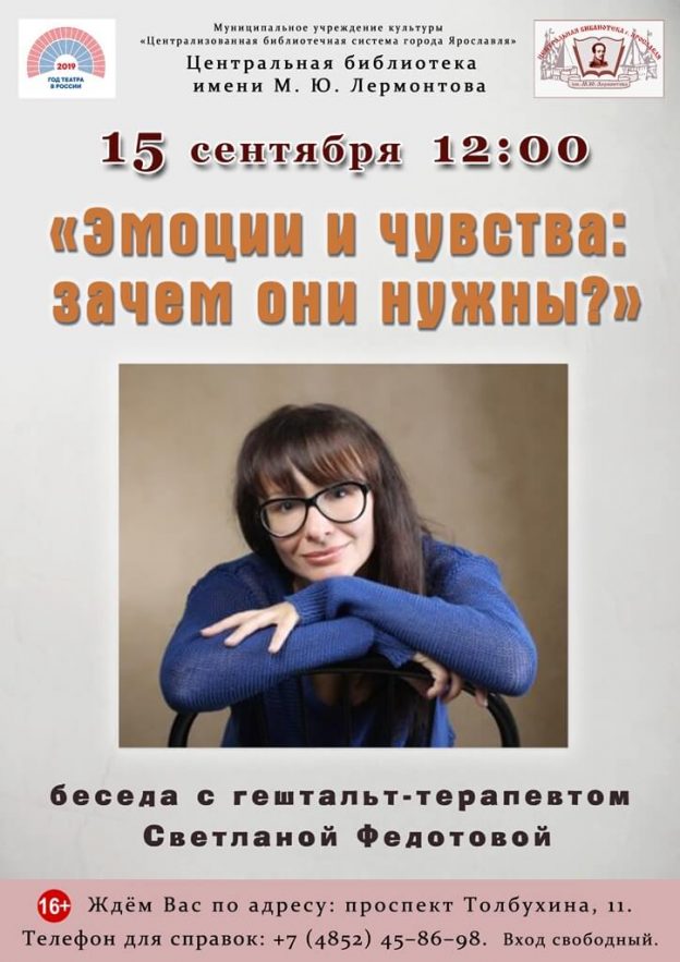 15 сентября в 12:00 в Центральной библиотеке имени М. Ю. Лермонтова состоится беседа с гештальт-терапевтом Светланой Федотовой «Эмоции и чувства: зачем они нужны?».