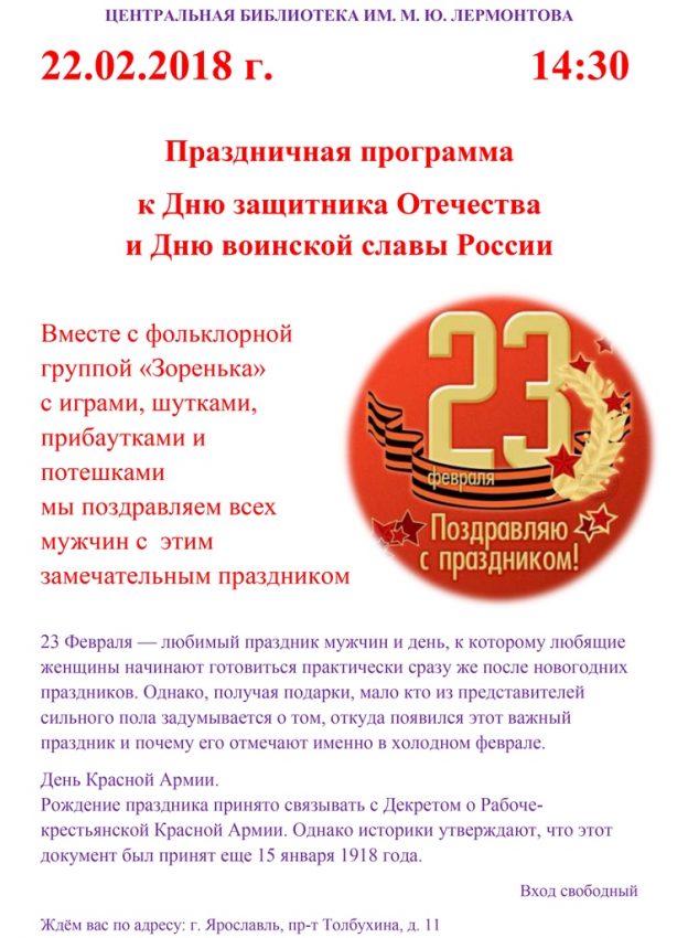 22 февраля 2018 г. в 14:30 в Центральной библиотеке имени М. Ю. Лермонтова состоится праздничная программа к Дню защитника Отечества и Дню воинской славы России.