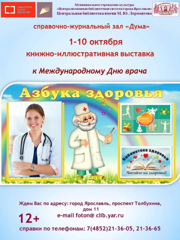 Необходимо не только победить болезнь, не менее важно, по возможности, не допустить развития хронических недугов. В честь Международного дня врача Центральная библиотека имени М. Ю. Лермонтова предлагает посетить книжно-иллюстративную выставку «Азбука здоровья» в справочно-журнальном зале «Дума», на которой представлены издания, открывающие разнообразные способы сохранения Вашего здоровья.