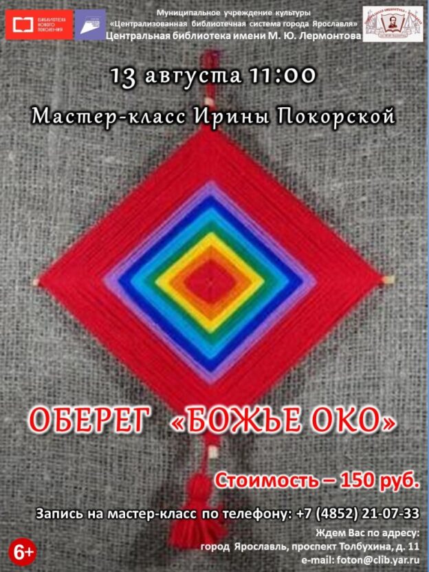 13 августа в 11 часов в зале краеведения «Золотое кольцо России» Центральной библиотеки имени М. Ю. Лермонтова состоится очередная встреча клуба выходного дня «Ладушка», на которой мы будем создавать оберег «Божье око».
