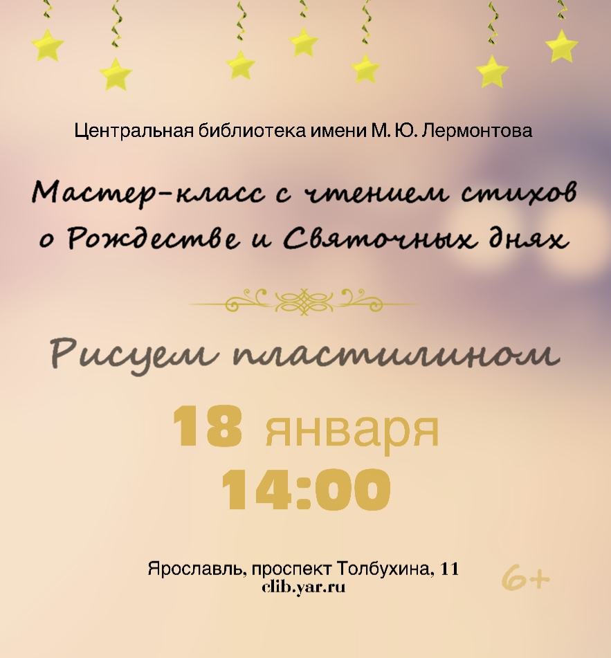 18 января в 14:00 в Центральной библиотеке имени М. Ю. Лермонтова состоится мастер-класс «Рисуем пластилином» по теме «Празднуем Святки» с чтением стихов русских поэтов о Рождестве и Святочных днях
