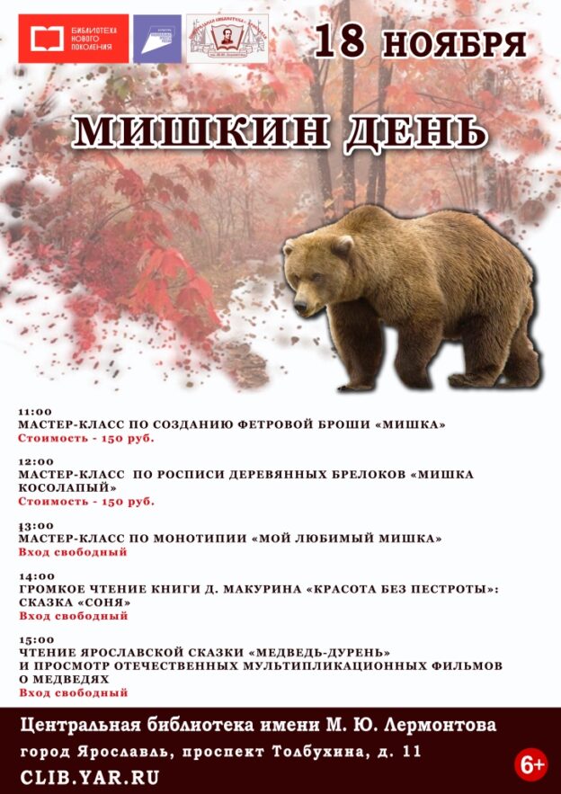 Как известно, ноябрь и начало декабря – время, когда один из наиболее популярных обитателей наших лесов – бурый медведь, красующийся на гербе города Ярославля, впадает в зимнюю спячку. А для того, чтобы сон его был безмятежным, мы предлагаем провести настоящий «Мишкин день», наполненный разнообразными мероприятиями, среди которых каждый может найти те, что придутся по душе.