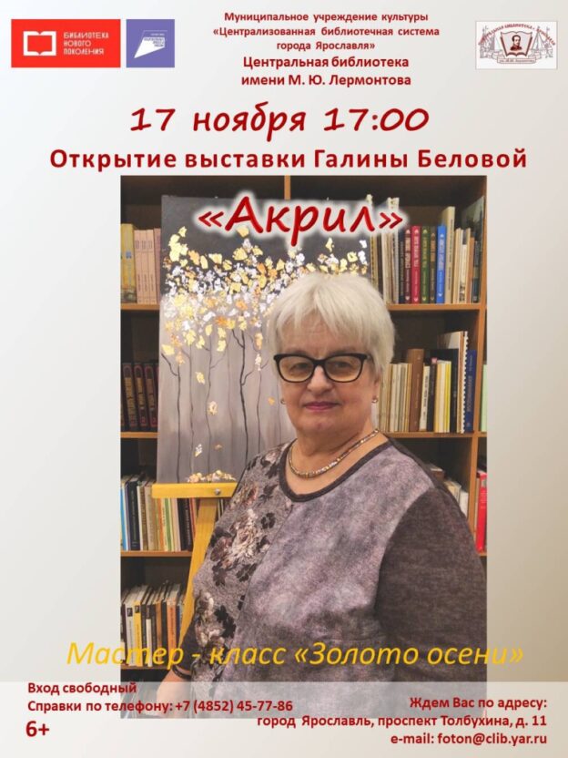 17 ноября в 17:00 приглашаем всех желающих в зал краеведения «Золотое кольцо России» Центральной библиотеки имени М. Ю. Лермонтова на открытие выставки Галины Беловой «Акрил».