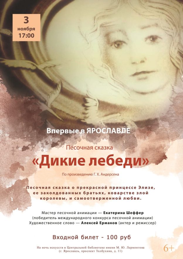 Мы все знаем и любим эту сказку, многие смотрели и ее экранизации. Но вот такого зрелища, какое предложат в Лермонтовке в Ночь искусств, Ярославль еще не видел. История «Диких лебедей» будет рассказана с помощью обычного песка: мастер песочной анимации, лауреат международного конкурса песочной анимации Екатерина Шеффер из Москвы представит песочную сказку в нашем городе впервые. Художественное слово прозвучит в исполнении артиста Алексея Ермакова.