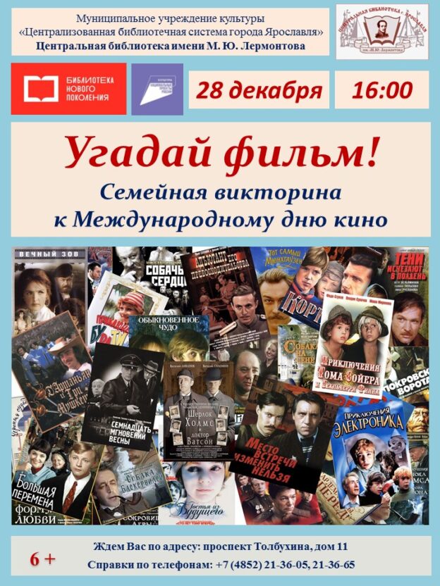28 декабря в 16:00 Центральная библиотека имени М. Ю. Лермонтова приглашает поучаствовать в семейной викторине «Угадай фильм!» к Международному дню кино.